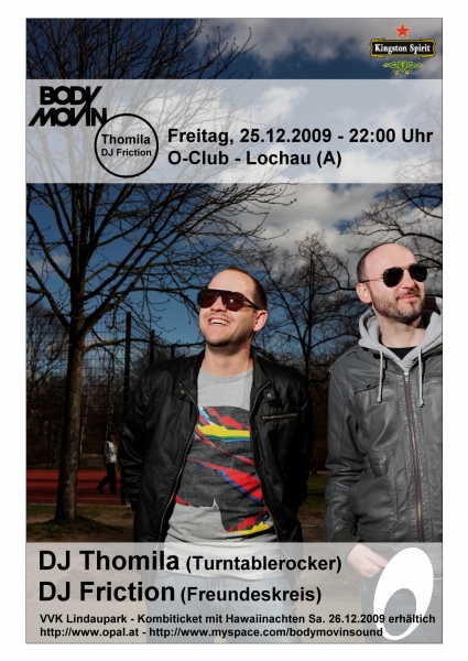 Am Freitag, den 25.12.2009, 22.00 Uhr ist im Lochauer Opal (O! Club) mit ?Body-Movin? die erste Liga elektronischer Musik zu Gast. Die Namen DJ Thomilla und DJ Friction sprechen für sich. Wenn die beiden Stuttgarter am Mischpult stehen, beginnen Electro, House und Funk&Breaks den Raum zu erobern, und jedes noch so standfeste Antitanzbein beginnt zu schwingen.