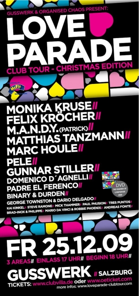 So gibt sich beispielsweise niemand geringerer als Felix Kröcher die Ehre und wird seine Fans mit feinstem Techno Sound begeistern. Mit Monika Kruse, ?the most beautiful women in Techno? und Sound-Art von feinsinnig bis stapfend ist der nächste Volltreffer vorprogrammiert. Der nächste im Kreis der Weisen ist M.A.N.D.Y. Der unbelievable DJ feiert ab, was abgefeiert werden sollte und bringt Goodfeel-Sound der Extraklasse in die Hallen des Gusswerk Salzburgs. Marc Houle liefert mit schlichter Eleganz ?Berlin Techno? & präsentiert noch dazu seine neuen Tracks erstmals am 25.12.! Als wäre dem noch nicht genug, steht dann noch Matthias Tanzmann an den Plattentellern und schafft mit eklektischem House Sound, satten warmen Tönen und dicken Bässen ein Wahnsinns Flow Gefühl. Ergänzt wird die LOVE PARADE Clubtour - Christmas Edition mit lokalen Größen der Bayerischen und Salzburger Techno Szene. Allen voran der süddeutsche Hoffnungsschimmer PELE.