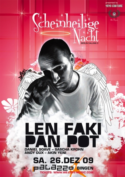 Die ?Scheinheilige Nacht? im Palazzo mit Len Faki, Pan-Pot, Andy Düx, Daniel Soave und Sascha Krohn. Bald schneit es wieder in Bingen und die Palazzo-Grenzgänger erfreuen sich einer bassgetränkten Spät-Weihnachtsnacht. Die Ritter rufen zur Tafelrunde: Erzengel Len Faki und Seine Scheinheiligkeit Pan-Pot erzürnen die Techno-Gemüter. Die Koryphäen der Minimal-Muse blasen gemeinsam zum Auftakt des Fegefeuers. Wir folgen unbrav in die Scheinheilige Nacht.