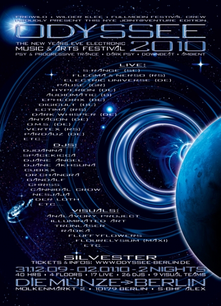 ODYSSEE 2010 - ein neues Joint@Venture zwischen den verschiedensten Berliner Party Crews wie Freiwild, Wilder Klee und der Fullmoon Festival Crew steht in den Startlöchern. Die erstmalige Zusammenarbeit im vergangenen Jahr im Berliner Tacheles zeigte für Berlin neue Möglichkeiten auf und war dementsprechend fruchtbar. In einer NEUEN LOCATION vom Allerfeinsten laden wir dieses Jahr vom 31.12. bis zum 02.01. zum 8. Mal zur Silvester ODDYSSEE in die Hauptstadt. Die ODYSSEE 2010 "Berlins New Years Eve Electronic Music & Arts Festival" wird diesmal mit 4 Floors die "MÜNZE BERLIN", im Herzen Berlins bespielen. Nahe dem Alexanderplatz, hinter dem Roten Rathaus, gegenüber dem Alten Stadthaus gelegen, bietet die "MÜNZE BERLIN" hervorragende Möglichkeiten, grössere Dancefloors und könnte nicht zentraler in Berlin liegen, als im Stadtteil Mitte gleich neben dem Fernsehturm. Seid willkommen 2 Tage & Nächte über 40 STUNDEN das neue Jahr mit vielen Gästen aus aller Welt zu feiern. Mehr als 50 Internationale Live-Acts, Djs, Visual- und Sound-Teams, Chai-, Cocktail-, Spacedrink- und Food-Stände, verwandeln diese neue Location in ein Festival der Sinne. Auf 3 Dance Floors und einem Chillout Space aufgeteilt gibt es PsyTrance-, FullOn-, Progressive Trance-, Downbeat-, Ambient- und Dark Psy-Sound, sowie Deko, Laser & Visuals vom Feinsten. Also lasst euch überraschen von der neuen Location, einem erstklassigen Line up, viel gutem Sound und einem überragenden Ambiente...hope to see everybody at one of the dancefloors - Lets get ready for take off into 2010 !!!