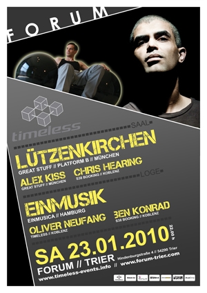 Timeless fegt mit einem Staraufgebot über die zwei Floors des Forums. Besonderes Schmankerl: die beiden ?Headliner? in Saal und Loge, Lützenkirchen und Einmusik, kommen mit exklusiven Live-Sets nach Trier!