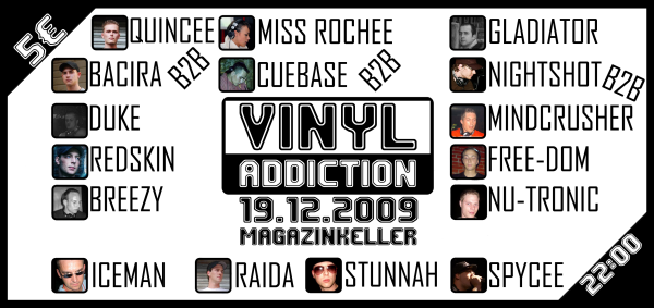 Auch lyrisch lassen wir keine Wünsche offen, denn erstklassige MCs wie MC Stunnah und MC Spycee versorgen uns mit feinsten Vocals am Mikrofon. Als Gastgeber werden die Vinyl Addiction Jungs das ganze Spektakel abrunden.