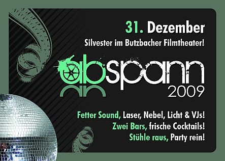 Nach dem großen Erfolg im letzten Jahr haben sich die Macher der ersten Silvester-Party im Butzbacher Kino entschlossen, die Veranstaltung zu wiederholen. Nun unter dem Motto ?Abspann2009?, geht es musikalisch wieder in Richtung elektronische