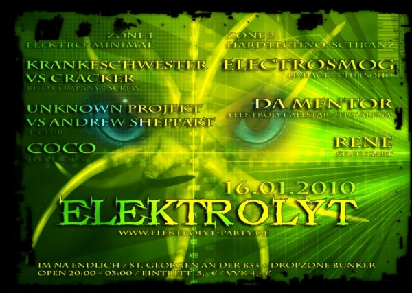 Wie Versprochen kommen wir im nächsten Jahr wider das Jahr 2010 soll das Technojahr von Elektrolyt werden darum starten wir den Jahresanfang gleich einmal mit einer Megaparty der Superlative , als Headliner wird uns Electrosmog im Hardtechnobunker - Dropzone , ein 2 h Live Set präsentieren , Rene aus Stuttgart wird den Bunker auf Betriebstemperatur hochfahren und Da Mentor wird die Menge mit seinem Brachialen Sound heftig aufmischen ! In der Bighall dürfen wir unseren Headliner Krankeschwester vs Cracker begrüßen die uns mit ihren Sound wider richtig zum Tanzen bringen , Coco wird die Bighall mit gängigem Electro - Minimal sound anfahren , Unknown Projekt vs Andrew Sheppart übernehmen die Hitzige Stimmung und fahren die Geräuschskulisse bis fast ganz nach oben !