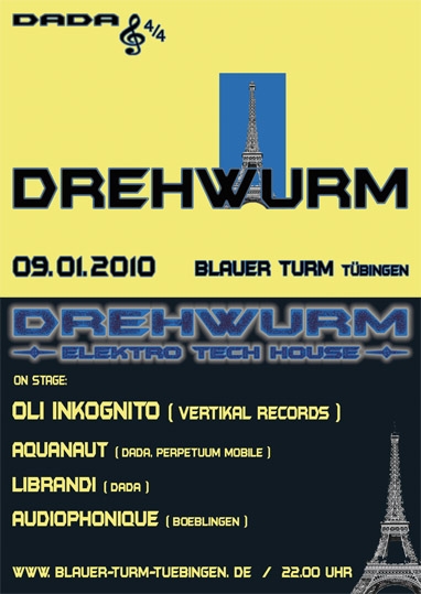 Als Drehwurm wird umgangssprachlich der Zustand eines starken Schwindelgefühls bezeichnet, welches vor allem durch schnelle aktive oder passive Drehbewegungen der entsprechenden Person hervorgerufen wird. Genau der Zustand des "Drehwurmes" kann erreicht werden, wenn am 09.01.10 folgende Akteure für Euch am Start sind: