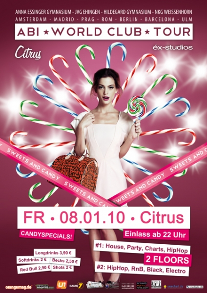 4 Schulen. 1 Party. Und ein gemeinsames Ziel: Das Abitur 2010! Wer bereits bei einer der ersten beiden Partys dabei war oder auch nur die Schlange vor dem Citrus gesehen hat, kann sich ausmalen, wie exzessiv die Floors im Club so richtig gerockt wurden! Eines wurde ganz klar bewiesen: Abiturienten können feiern! Die Gymnasien Hildegard, Anna Essinger, Ehingen und NKG Weißenhorn laden euch deshalb am 08.01.10 ab 22:00 zur Fortsetzung - der Sweet and Candy Edition - ein! Und diesmal wird die Party noch heisser! Auf die ersten 200 Gäste wartet ein ganz besonderes Candy Special - lasst Euch überraschen! Exklusiv für Euch konnte wieder das DJ Team von ulmercampus.de gewonnen werden ? diese Jungs heizen Woche für Woche jeden Donnerstag auf den größten Unipartys der Stadt die Tanzflächen bis zur Extase auf: Auf dem Main Floor gibt es House, Party und Charts auf die Ohren, der obere Floor ist den Fans von Hip Hop und Electro vorbehalten! Und es gibt ein weiteres exklusives Highlight: sensationell günstige Getränkespecials! Becks geht für nur 2,50 Euro über die Theke, alle Longdrinks sind für magere 3,90 Euro zu haben, Red Bull kostet schlappe 2,90 Euro und für alle Softdrinks und für alle Shots sind nur sensationelle 2,00 Euro zu berappen! Don't miss the Candy Edition! Party on!