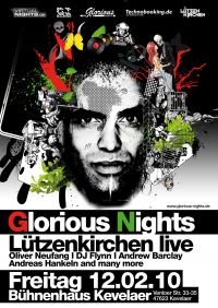 Glorious Nights präsentiert sich im neuen Jahr in Bestform. Die Glorious-Crew lässt sich nicht lumpen und schießt mit einem Top-Act nach dem anderen aufs Line-Up. Nachdem DJ´s wie Einmusik und Oliver Klein bereits ein Highlight am Niederrhein sind, wird nun für Februar einen Mann an Bord geholt, der seit etwa zwei Jahren nicht nur in der Techno-Szene in aller Ohren ist: Tobias Lützenkirchen! Spätestens durch seinen Hit ?3 Tage wach? ist er der Shooting-Star der Elektronischen Szene! Als zusätzliche Mainacts kommen Oliver Neufang und DJ Flynn zur Carnival Session. Ergänzt wird das Wahnsinns Line-Up durch den Glorious Nights Residents und DJ´s Andrew Barclay, Andreas Hankeln, Benuses, Christan Prieß, Jim Cavanian und Mark Neumann.