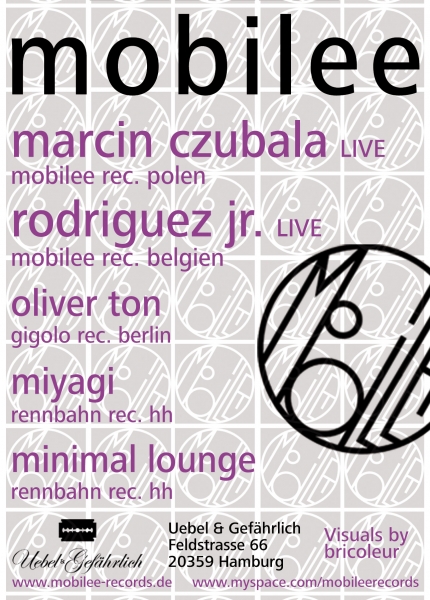 Groß vorzustellen brauchen wir Mobilee, das Berliner Vorzeigelabel für elektronische Musik, an dieser Stelle eigentlich nicht, denn das regelt das hiesige Nachtleben von allein: Was für eine künstlerische Ausrichtung die Chefs Anja Schneider und Ralf Kollmann mit ihrer Arbeit verfolgen, bekommt man regelmäßig und quer durch alle Hamburger Clubs bei den Sets von zum Beispiel Pan-Pot, Vincenzo, Solomun, Cassy, Dinky, Magda, Jennifer Cardini oder Marcin Czubala zu hören. Sie sind allesamt exklusiv auf dem Label vertreten oder haben in letzter Zeit mit Mobilee zusammengearbeitet. Zur Veröffentlichung ihrer vierten Compilation der "Back To Back"-Reihe seit 2005 (eine CD mit 2009er Label-Highlights, eine mit And.Ids jazzigem Ausblick auf 2010) veranstalten die Hauptstädter jetzt im Uebel & Gefährlich die große Labelnacht: Marcin Czubala von Mobilee Polen und Rodriguez Jr. aus Belgien zaubern live aus ihren Techno- und Electrohütchen, die DJs Oliver Ton von Gigolo Records aus Berlin und Minimal Lounge & Miyagi von Rennbahn Records unterstützen sie dabei. Das finden wir mehr als angemessen. (Quelle: Prinz.de)