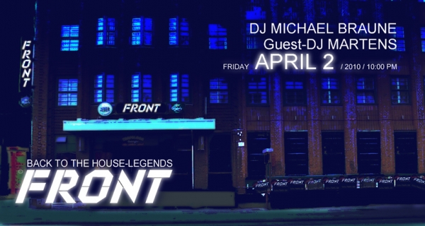 Für den Karfreitag in 2010 konnten wir widerrum den Original-DJ der damaligen Zeit gewinnen : DJ Michael Braune (Front 1990 ? 1993). Mit ihm dreht Special-Guest-DJ Martens das Vinyl, bis heute einer der treuesten FRONT-Gänger und Vinyl-Experte dieser Zeit. Beide werden in der Nacht der House-Legenden diese wieder lebendig machen.