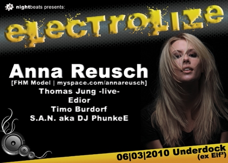 Für das OPENING präsentieren wir Euch Anna Reusch! Sie ist Top Model und Djane in einer Person. Seit einigen Jahren ist das eine unschlagbare Kombination! Ob auf den Titelseiten der FHM, des Matador und der Glamour oder als gefeierte Techno Djane, immer macht sie eine gute Figur und das nicht ?nur? weil sie gut aussieht, sondern auch weil sie den Freunden elektronischer Musik einen erstklassigen Mix bietet. Sie ist auf diversen Festivals unterwegs wie z.B. auf der Nature One oder dem Summerwave und natürlich auch in großen Clubs, wie dem U60311 in Frankfurt, dem Penthouse in Stuttgart oder der Elektroküche in Köln.
