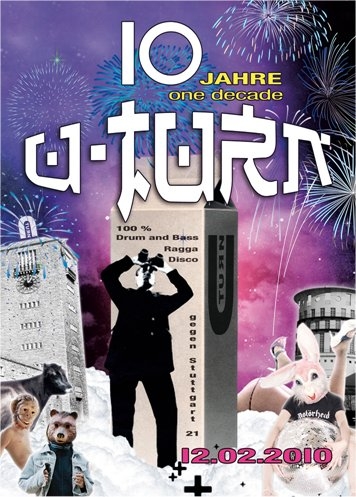 Zehn Jahre U-Turn bedeuten für uns: das Miterleben verschiedener Generationen, das Wachsen einer Party-Szene in sämtlichen Musikrichtungen, die auf dem dritten Floor von Techno, Hip-Hop, Miami Bass, Elektro, Punk-Rock, House, Breakbeats und Minimal in ständigem Wechsel gespielt wurden, und natürlich ein Dankeschön an die treuen U-Turn Gäste der erste Stunde.