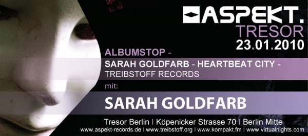 Passend zum Jahresanfang startet Aspekt das neue Jahr für euch wieder im ganz großen Rahmen und so wurden keine Mühen gescheut Liebhabern elektronischer Tanzmusik auch dieses mal wieder ein Hörgenuss der ganz besonderen Art zu bereiten. Bekannt für ihren ganz eigenen unverkennbaren Sound und ihre erfolgreichen Veranstaltungen und Open Airs ist Aspekt stolz darauf, euch in Zusammenarbeit mit Treibstoff und Kompakt ein ganz besonderes Line Up zu präsentieren. Und so erwartet euch am 23. Januar 2010 um 23 Uhr im Tresor ein spektakuläres Musikerlebnis. Als Highlight wird der junge Franzose Sarah Goldfarb (Treibstoff), exklusiv für Aspekt das erste Mal sein Album "Heartbeat City" vorstellen, welches im Januar auf Treibstoff erscheint. Ihr seid also die ersten, die in den Genuss kommen werden, seinen neusten Produktionen zu lauschen. Der Sound des talentierten Künstlers hypnotisiert die Sinne und beeindruckt durch seine Vielseitigkeit und Dramaturgie. Ein kreativer und begnadeter Musiker der mit seinen Beats den Tresor zum kochen bringen wird. Als weiteres Highlight wird euch der allseits bekannte Maetrik (Treibstoff) mit seiner Live-Performance einheizen. Sein frischer und einzigartiger Sound, ohne Regeln und Beschränkungen, machen ihn zu einem außergewöhnlichen Künstler, der eure Ohren durch und durch verwöhnen wird. Und auch Kolombo (turbo/col mojito) der extra aus Brüssel eingeflogen wird, um euch mit seinen elektronischen Klängen zu verzaubern, steht den beiden in nichts nach. Auch Mitja Prinz (Yes Watergate), Pharyx (Stockholm) und Tobias Koch (The Records) sind mit von der Partie um zusammen mit euch den Tresor zu rocken. Unsere Freunde Cotumo und The Ascent von AKA AKA (Stil for Talent) die inzwischen mit ihrem eigenen Label Burlesque Music durchstarten, werden ebenso für ordentlich Stimmung sorgen. Andy Kohlmann (Lordag/Extrasmart) und Mike Wall (Lordag/Safari) sind ebenfalls vor Ort um eure Herzen mit ihren kreativen und außergewöhnlichen (grandiosen) Livesets höher schlagen zu lassen. Die Künstler der Aspekt Family machen den Abend perfekt und so werden Marcio Kantana (live), Microtune & Takter, Match Hoffman, Sebastian Bosch, Oliver Playford, Steven Beyer, Dan Reed, Digital Report, Miguel Rodriguez, Michél Voisin und Marlina eure Sinne mit ihrem einmaligen Sound betören. Zur Krönung wird Aspekt die neusten Releases Aspekt 013 von Microtune & Takter sowie Aspekt 014 von Match Hoffman vorstellen. Auch diesem Abend steht also nichts im Wege um für euch unvergesslich zu werden.