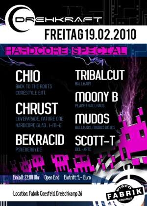 Drehkraft 19.02.10 Hardcore Special Chio, Mudos, Chrust, Moony B & Itchy Live Knallen euch im Hardtechnokeller mit Hardcore, Hardcoreclassics, Happy und übelstem terror die Ohren blutig! Im Club Böll präsentieren euch Moony B, Scott-t, Tribalcut und dieses mal wieder unseren Acid-Resident Bekracid mit Feinstem House, Fettem Minimal, Strömendem Electro, Technoclassics und geilem Acid!