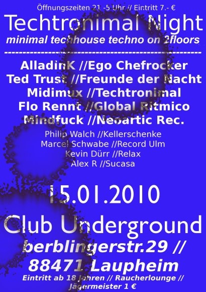 Speziell für diesen Anlass hat Techtronimal überregional bekannte Djs und Künstler aus Ulm München und Laupheim zusammengetrommelt die für einen abwechslungsreichen und stimmungsvollen Abend sorgen.