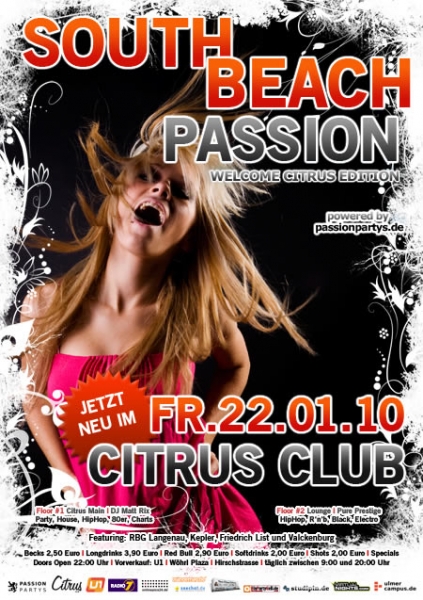 PASSION goes CITRUS! Künftig wird es im Citrus heiss: Die Passion Partys ziehen in ihr neues Zuhause! Und zum Einstand steht standesgemäß eine heisse Party auf dem Programm: Unter dem Motto South Beach Passion werden im Citrus Club auf 2 Floors tropische Temperaturen herrschen - wer zu diesem Motto schon einmal auf einer Passion war, weiss, dass die Floors Kopf stehen werden! Auf Floor #1 könnt Ihr zu Party, House, HipHop, Charts und Rock so richtig rocken und in der Lounge, Floor #2, legt exklusiv für Euch erstmals das Pure Prestige DJ Team die heissesten House-, Electro- und Minimalvibes auf! Natürlich wird standesgemäss auch der Geldbeutel geschont: Becks gibt es für sagenhafte 2,50 Euro, alle Longdrinks schlagen mit nur 3,90 Euro zu Buche, original Red Bull kostet nur 2,90 Euro, alle Softdrinks magere 2,00 Euro und alle Shots sind ebenfalls für nur 2,00 Euro zu haben! Passion Deko! Riesen Verlosung! Als Special: In der ganzen Stadt werden Welcome Bons versteckt! Lasst Euch überraschen. Vorverkauf wie immer im U1 im Wöhrl Plaza in der Hirschstrasse! Live Life as a Passion! Party on!