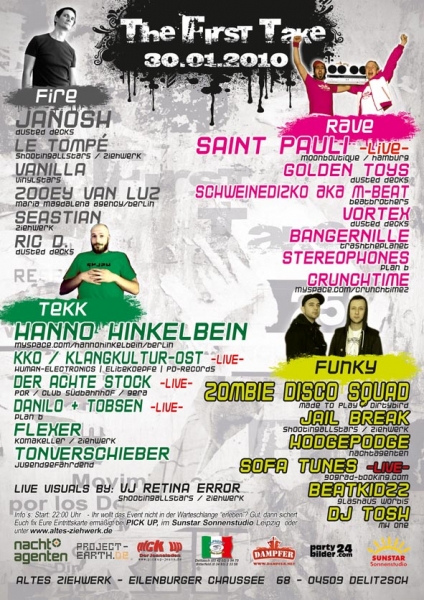 Der erste Streich in Delitzschs glorreichem Club ist direkt ein musikalischer Rundumschlag. Als Rädelsführer kristallisieren sich die beiden Hamburger Partymonkys St. Pauli heraus. Bereits zum 2. Mal diktieren sie euch ihre Philosophie vom neuzeitlichen Electrospaß. Dabei werden derbe Beats mit E-Gitarren und wilden Vocals gemischt. Den Technothron besteigt derweilen Hanno Hinkelbein, dessen Grundsubstanz ein herrlich harscher Technobeat mit unzähligen Knarz- & Quitschelementen ist. Auch neuer musikalischer Wind zieht durchs Ziehwerk, namens Zombie Disco Squad, Residents der Panorama-Bar und Funky-Electro-Minimal Produzenten der Stunde. Die insgesamt