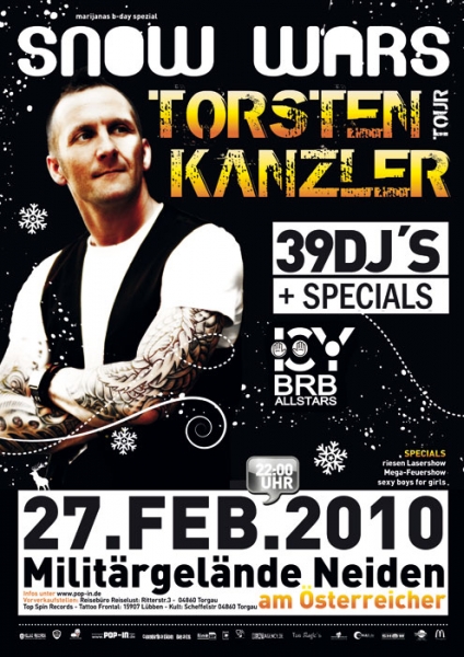 Nach der erfolgreichen Beat Wars Session im vergangenem Jahr melden sich die Macher zurück und hoffen das der Schnee nicht allzu leise daher gerieselt kommt. Aber mal ehrlich, bei dem Line-Up kann da gar nix schief gehen! Denn neben dem fetten Brocken Torsten Kanzler (Tresor, Mayday, Nature One?), werden Euch auch Alexander Weinstein, Talisman, Miss Baerlina, Base,Leigh Johnson, DISKOTON sowie Zyklon B da hinschmelzen lassen, um nur einige der 40 Akteure des Schneekriegs zu nennen.