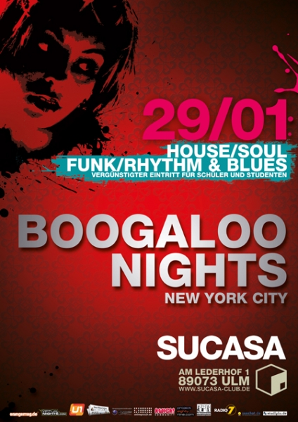 ULM welcomes NEW YORK CITY! Boogaloo Nights ? die neue Partyreihe im Su.Casa - startet am 29. Januar! Und zum Start könnt Ihr Euch auf eine Party gefasst machen, die Euch nicht mehr loslassen wird! Kreiert in New York City, der Stadt, die niemals still steht, wird in Ulm der bebende Puls der Großstadt Einzug halten! Boogaloo ? diese Fusion steht für eine heisse tanzbare Mischung aus House, Soul, Funkhouse und Rhythm & Blues! Die 3 DJs werden Euch mit ihrem mitgebrachten Repertoire bis zum Morgengrauen in Extase versetzen ? obwohl ? oder gerade weil - auf Remixe bewusst verzichtet wird! Zu dieser Musik soll man eines: ausgelassen feiern, tanzen und mitsingen! Get the Feeling of Boogaloo! Vergünstigter Eintritt für Schüler und Studenten! Ein begrenztes Vorverkaufskontingent gibt es im U1 im Wöhrl Plaza in der Hirschstrasse! Los geht es um 23:00 Uhr! Dress cool! Celebrate! Feel Sexy! Party on!