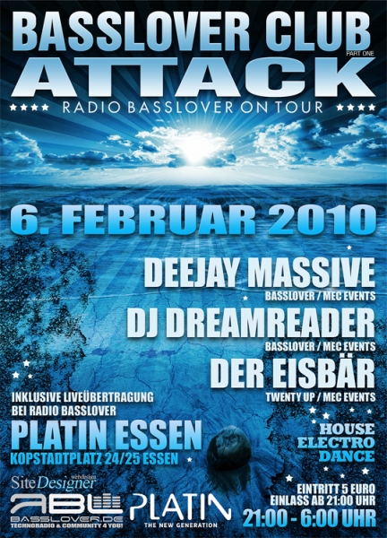 Am 6.2.2010 ist es endlich soweit. Radio Basslover startet seine Clubtour mit dem Namen "Basslover Club Attack" zum allerersten mal in Nordrhein Westfalen. In der Ruhr Metropole Essen schlägt die Pulsader des Clublebens in NRW und genau dort starten wir für Euch richtig durch.