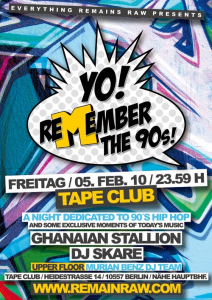 Freitag/ 05. feb .2010/ 23.59h yo! remember the 90s GHANAIAN STALLION DJ SKARE MURIAN BENZ Tape Club/ Heidestr.14/ 10557 Berlin/ Hauptbhf.
