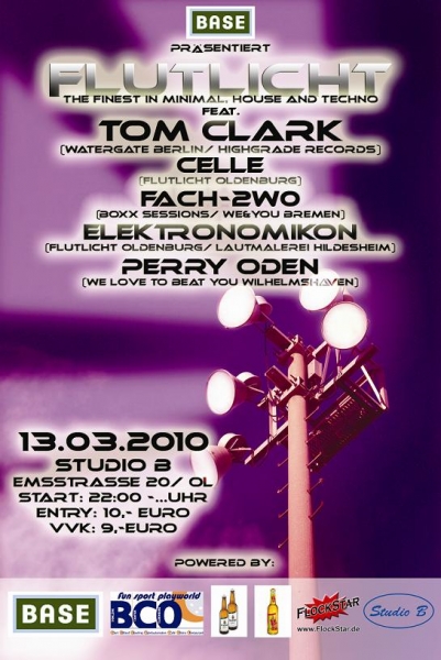 Am 09.01.2010 wurde Flutlicht im Studio B kurz nach Sylvester in einer Schneekatastrophe geboren. Draußen war es mächtig kalt doch innen ging mehr als nur die Post ab. Jens Bond, Hey Karolin, Celle und Elektonomikon sorgten an diesem Abend für schweißnasse Gesichter, Wadenkrämpfe und durchgetanzte Schuhe. Um acht Uhr morgens mussten wir leider das Licht anmachen obwohl die Tanzfläche und der Laden immer noch prall gefüllt waren? nun geht es weiter?.