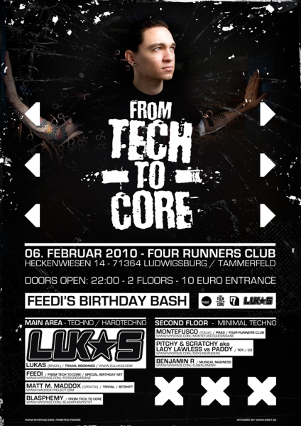 Sonst nur im Duo anzutreffen haben sich die beiden Stuttgarter Nachwuchs DJ's zu Ehren von Feedi's Geburtstag was ganz besonderes ausgedacht: in dieser Nacht werden sie einzelen auflegen und ganz besondere Sets von den Plattenspielern zaubern. Wer die Partyreihe "From Tech to Core" die die beiden ins Leben gerufen haben kennt, weiß was er zu erwarten hat. Stilistisch lassen sie sich nicht in eine Schublade stecken, sie bewegen sich von Hartem Techno über Hardtechno bishin zu Industrial Hardcore. Der größte Höhepunkt ihrer Laufbahn war der Auftritt auf Europas größtem Festival für elektronische Musik der Nature One 2009.