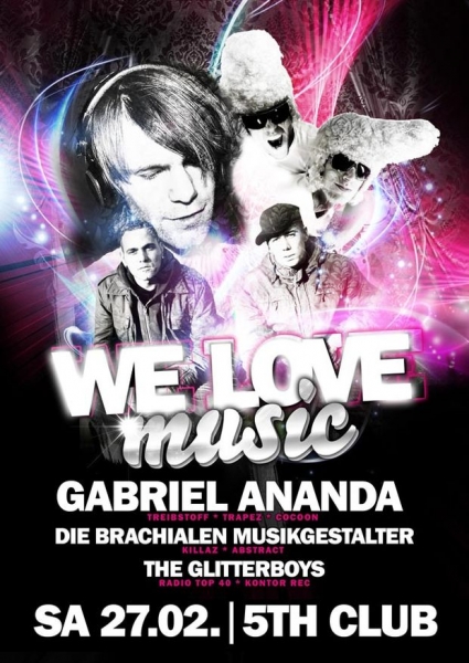 We love Music - und genau deswegen spielen heute Nacht bei uns nicht DJRaufRunter und seine Freunde, sondern 3 der wohl renommiertesten und besten Acts ihres Faches. Wir freuen uns auf Gabriel Ananda, die Brachialen Musikgestalter, The Glitterboys und auf Dich!