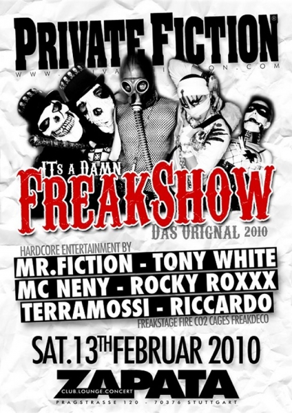 100% FREAKSHOW ist angesagt im ZAPATA. Diese Party ist für einige das allerbeste Motto von PRIVATE FICTION überhaupt. Desshalb haben wir es uns zum erklärten Ziel gemacht diese Nach noch spektakulärer zu gestalten als alle bisherigen Events im Zapata. Bist Du ein Freak? Stehst du auf hart Beats, übertriebene Stimmung und Exzessives feiern? Dan bist Du bei dieser Party genau richtig und wirst es lieben: FeuerShow, CO2-Booster, DragQueens, Freakdeco, Dresscode Feeling und das alles kombiniert mit den neusten Elektro, Minimal und Techno-Tunes gespielt von unseren aktuellen Top-DJs: TONY WHITE, MR.FICTION, ROCKY, ROXXX, TERRAMOSSI, RICCARDO. Und als ob das nicht schon genu währe wird die Stimmung vom unübertroffenen "Rockstar" MC NENY zum absoluten Peak getrieben! YEAAAAHHHH, so muss das sein. Internationales Feiern auf höchstem Nievau.