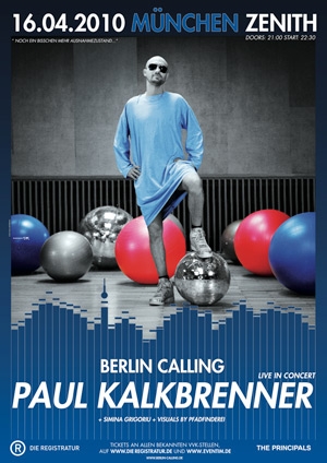 Hannes Stöhr?s ?Berlin Calling? ist über die freie Zugänglichkeit im World Wide Web und den international explodierenden DVD Release längst auch außerhalb Deutschlands Kult und der dazugehörige Soundtrack gilt als bestverkaufter BPITCH-Release aller Zeiten.Titten, Techno und Trompeten funktionieren zusammen eben ganz prächtig! Vor allem in der jetzigen Form, da er antritt, die Welt noch einmal im richtigen Leben zu erobern, allerdings ohne sich ? wie in der fiktionalen Vorlage ? die Flügel an der Sonne zu versengen. PAUL KALKBRENNER ? LIVE IN CONCERT. Yep, die Zeiten des kleinen Live-Acts sind vorbei, jetzt macht er Konzerte und zwar die richtig großen Bühnen. Über zwei Stunden (!) KALKBRENNER live, die BERLIN CALLING Hits in der einen Tasche und jede Menge neues Material in der anderen. Mit einer neuen, phantastischen Live-Bühnenshow, bei der die PFADFINDEREI, das international vielleicht meist gerühmte Videokunst-Kollektiv, die visuelle Gestaltung übernimmt, sollte dem Weg zur Weltherrschaft eigentlich nichts mehr im Wege stehen. Wenn ihr jedenfalls mal euren Kindern erzählen wollt, wie das so war mit Techno am Beginn des 21. Jahrhunderts, dann werdet ihr um dieses Konzert nicht umhin kommen. Wie immer gilt: Wer früh die Karten kauft, muss sich an der Abendkasse nicht darum prügeln. Oh, ganz wichtig noch: Da es sich wie gesagt um ein Konzert handelt, beginnt der Spaß um 21H. Früh da sein lohnt sich, wenn man Herrn K. nicht bloß als kleinen schwarzen Punkt am Horizont wahrnehmen will...