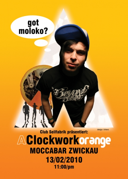 das Uhrwerk dreht sich weiter und die nächste Ausgabe des Klassikers Clockwork Orange steht vor der Tür. Clockwork Orange das ist der Inbegriff für verwirrend, monumental, chaotisch, wahnsinnig, paranoid und subkulturell, gepaart mit einer Spur von Modern Art. Die Protagonisten dieses Postmodernen Abend, erwarten euch mit einer schizophrene Mischung aus Techno & Electro Beats, in den Gefilden der alten Moccabar in Zwickau.
