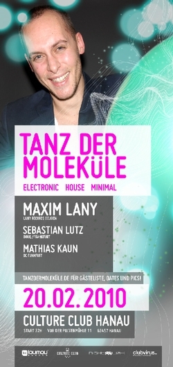 Als wahren Wiederholungstäter in Sachen Tanz der Moleküle kann man den Belgier Maxim Lany bezeichnen. Zuletzt zeigte er im Oktober 09, was die belgische Elektro-Szene zu einer der besten in Europa macht. Seine Auftritte im Culture Club haben ihm bereits viele Fans in Hanau eingebracht. Neben seinen Tätigkeiten als DJ betreibt er auch ein Plattenlabel und einen Plattenladen in seiner Heimatstadt Gent. Die Reise nach Hanau tritt er also mit jeder Menge frischer Musik an.