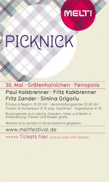 Am Sonntag, dem 30.05.10, gibt es eine exklusive Vorab-Party in Ferropolis für alle Festivalliebhaber und Technojünger, die es nicht erwarten können, endlich wieder an der frischen Luft zu feiern. Die Tagesveranstaltung Melt! Picknick wird von nun an jährlich von einem bedeutenden Künstler aus dem weiten Feld der elektronischen Musik kuratiert. Das Programm 2010 wird in enger Zusammenarbeit mit der Berliner Techno-Legende Paul Kalkbrenner zusammengestellt, der beim Melt! Picknick seine einzige Open Air Show in Ostdeutschland spielen wird. Konzentriert auf einer Bühne werden Paul Kalkbrenner & Freunde ein gemütliches Tages-Set spielen. Und wenn Paule zum musikalischen Familientreffen einlädt, dann kommt nicht nur sein Freund Fritz Zander, sondern auch seine Freundin und sein Bruder, um den Sommer gemeinsam gebührend einzuläuten. Kalkbrenner is calling, und ihr seid unbedingt eingeladen.
