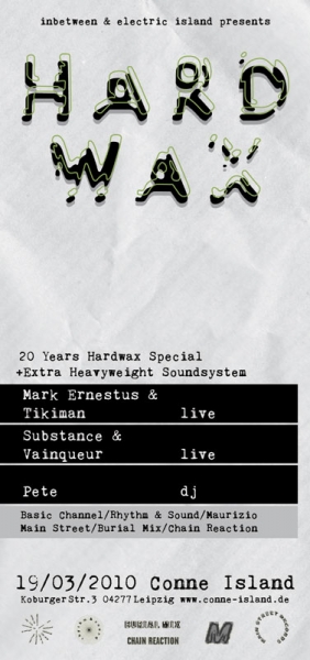 Von Mark Ernestus 1989 gegründet, ist das Hardwax Zeuge erster Stunde, als Berlin zur Stadt des Techno wurde. Seitdem ist es Anlaufstelle für Musikliebhaber elektronischer Musik von Techno/House und Disco über Dubstep bis hin zu Aphex Twin. Berühmt ist das Hardwax aber auch für seinen großen Dub- und Reggae-Backstock, welcher in Verbindung mit dem ebenfalls im Hardwax gelagerten Killasan Soundsystem, jamaikanischer Bauart aus dem japanischen Okinawa kommend, schon aufzeigt, welchem historischen Bewusstsein man sich besonders verpflichtet fühlt: nämlich der Wurzel aller Dance bzw. Bassmusik, der jamaikanischen Soundsystemkultur.