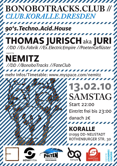 Nach dem Start der Partyreihe ?BonoboTracks.Club? am 9.1.2010 mit dem Berliner DJ + Veranstalter Michael Placke [exquisite-berlin, reclaim the sparkasse] präsentiert Nemitz am 13.2.2010 ein ?Urgestein? der Dresdner Szene ? Tomo enO aka Thomas Jurisch aka Juri im Club Koralle an den Plattentellern.
