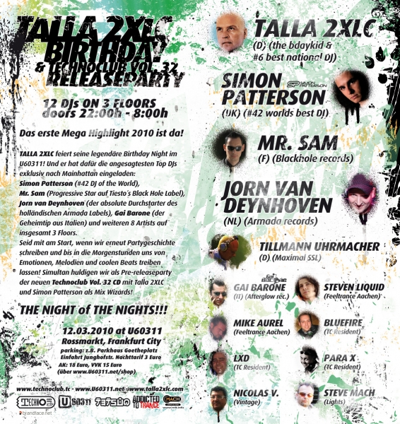 Nach der großen 25-Jahre-Technoclub-Party im Dezember, als nahezu 1000 begeisterte Clubber mehr als zehn Stunden lang nonstop durchfeierten, dachte man schon, dass keine Steigerung mehr möglich sei. Doch Talla 2XLC zeigt, dass man auch das noch toppen kann und hat anlässlich seiner alljährlichen Birthday Celebration sowie der Releaseparty der neuen Technoclub-Compilation, welche nun auch schon auf sagenhafte 32 Volumes zurückblicken kann, ein Line Up der Extraklasse zusammengestellt.