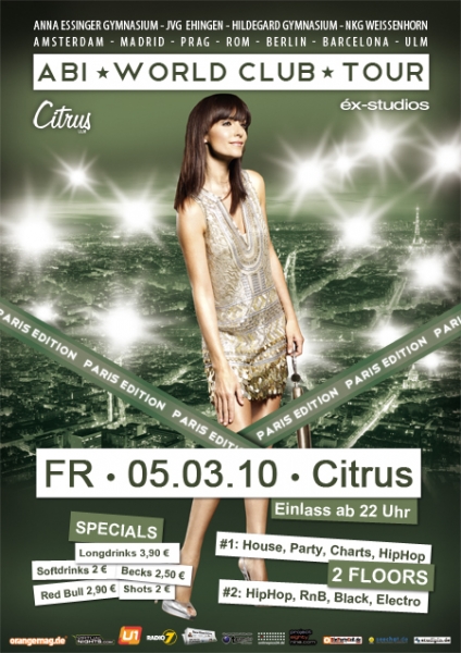4 Schulen. 1 Party. Und ein gemeinsames Ziel: Das Abitur 2010! Und mit ihrer Feierlaune haben sich die Abiturienten inzwischen einen echten Namen in Ulm gemacht! Standesgemäss laden die Gymnasien Hildegard, Anna Essinger, Ehingen und NKG Weißenhorn zur nächsten Party: Die Abi World Club Tour Part V findet unter dem Motto Paris Edition am Freitag, den 05.03.10 ab 22:00 im Ulmer Citrsu Club statt - und diesen Termin solltet Ihr Euch schon jetzt fett einrahmen! Ausnahmezustand! Wie immer legt exklusiv für Euch das DJ Team von ulmercampus.de auf ? diese Jungs heizen Woche für Woche jeden Donnerstag auf den größten Unipartys der Stadt die Tanzflächen bis zur Extase auf: Auf dem Main Floor gibt es clubbigen House, Party und Charts auf die Ohren, der obere Floor ist den Fans von Hip Hop und Electro vorbehalten! Und es gibt wie immer ein weiteres exklusives Highlight: sensationell günstige Getränkespecials! Becks geht für nur 2,50 Euro über die Theke, alle Longdrinks sind für magere 3,90 Euro zu haben, Red Bull kostet schlappe 2,90 Euro und für alle Softdrinks und für alle Shots sind nur sensationelle 2,00 Euro zu berappen! Feel Paris! Dress Famous! Party on!