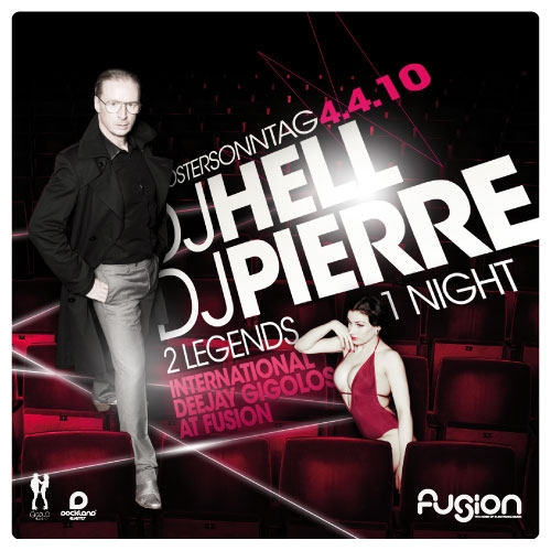 Was für ein Fest am Ostersonntag! Niemand geringeres als DJ HELL kommt endlich wieder nach Münster. Der internationale Superstar DJ, der mit seinem Album Teufelswerk wieder einen Meilenstein gesetzt hat und u.a. mit P.Diddy und Bryan Ferry im Studio war, kommt allerdings nicht alleine und bringt wieder Mitglieder seiner International Deejay Gigolos mit. U.a. niemand geringeres als DJ PIERRE, dem Begründer des Acid House Sounds aus Chicago, einem Wegbegleiter aus Dockland Zeiten und einer der größten DJ Legenden überhaupt. Der Titel dieses ersten großen Highlights in 2010 im Fusion sagt eigentlich schon alles. 2 LEGENDS ? 1 NIGHT! Abgerundet wird dieses Freudenfest von 9 weiteren Künstlern. Darunter gibt es als Special einen Liveact der SNUFF CREW, einem weiteren Mitglied der sensationellen Gigolo Family.