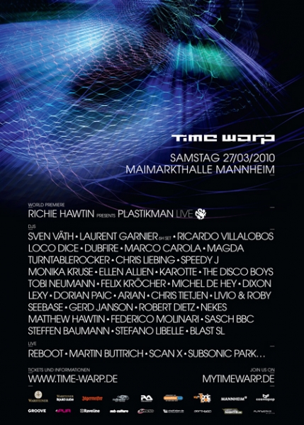 Das Line Up für die Time Warp 2010 wird ohne Zweifel jenen hochqualitativen Standard beibehalten, den Ihr von ihm erwartet. Besonders stolz sind wir auf die Weltpremiere der neuen Plastikman Show, dem legendären Produktions Alter Ego von Richie Hawtin. Auf der Time Warp wird er seine neue Multimedia Performance erstmalig vorstellen, bevor er mit einer weltweiten Tour auf ausgewählten Festivals zu Gast sein wird.