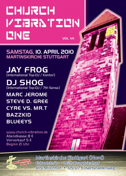 Bereits zum 7. Mal öffnet die Stuttgarter Martinskirche zum großen Benefiz-Event der elektr. Musikszene ihre Tore. Das altehrwürdige Gemäuer wird mit einer perfekten Sound- u. Lichtanlage in Szene gesetzt. DJs: Jay Frog, DJ Shog, Marc Jerome, Steve D. Gree, Cyre vs. Mr.T, Bazzkid, Blueeys...
