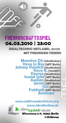 Mit 2 Tanzschaften und Euch wollen "Idealtechno" und "Mit Freunden Feiern" am 6. März im Spielraum Club (Wiesenweg 5-9, 10365 Berlin) auf einer neuen PA und zwei mit Liebe umgebauten Floors Wiedergutmachung in Sachen Sound of Berlin betreiben. Fair Play statt Grütze Calling. Fairytale? Auf jeden Fall Elfmeter!