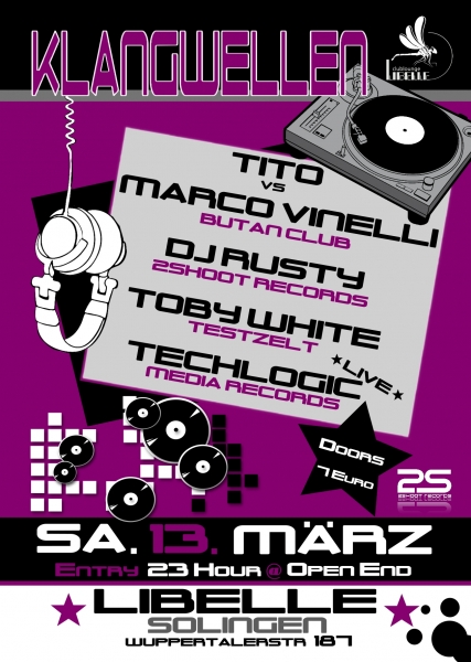 KLANGWELLEN ist das neue Project/Konzept zweier DJs & Veranstalter aus dem NRW Raum........präsentiert was es den Sound betrifft wird alles von Tech/Electro House über Progressive bis zum Techno Sound und das ganze performt von New Comer DJs bis hin zu Regionalen DJ Größen. Viel Wert wird dabei auf das familiäre Ambiente und ablaufen der Partys gelegt damit sich jeder Gast individuell wohl fühlen kann u. auch soll "eben wie zu Hause und mit Freundeskreis"......umgesetzt wird das ganze in einer Location über die man wohl kein Wort mehr verlieren brauch den diese gehörte schon fast zum Inventar der Stadt Solingen und zählte schon früher zu den Locations die für eine gute Party sprach.....wir reden hier von der Libelle/Solingen die jetzt einen neuen Aufschwung erlebt was es den Electronischen Sound betrifft! Freut Euch auf unserern Eröffnungs- Event der Klangewellen Party Reihe mit einem Line Up was für sich sprich. Keine geringeren wie die Resident DJs "TITO vs. MARCO VINELLI" des Butan Clubs/Wuppertal werden zur Klangwellen First Edition an den Reglern stehen, unterstützt werden sie von DJ RUSTY, über den man wohl kaum mehr was sagen muss, ein erfahrener DJ der ersten Stunde in der Electronischen Musik Szene.....da sprechen eine geballte Ladung Erfahrung u. Soundkenntnissen für sich die sich in seinen Sets wieder spiegeln. Natürlich wollen wir die beiden anderen Act's nicht vergessen, ganz im Gegenteil vorn weg TOBY WHITE der mit seinen Set jeden Tanzfläche zum beben bringt und der ganz und gar kein unbeschriebenes Blatt mehr ist in der Szene in NRW....Zu guter Letzt TECHLOGIC aka SHAWN BAITS " nicht nur Mitbegründer der neuen Partyreihe "KLANGWELLEN" nein auch schon ein alter Hase in der DJ u. Musik Szene und hier mit seinem neuen Project TECHLOGIC Live am Start, wo ihr auf ein nach vorne gehendes Live Set's gespannt sein dürft! Freut Euch auf eine Party die vielseitigen und abwechslungsreichen Sound verspricht.