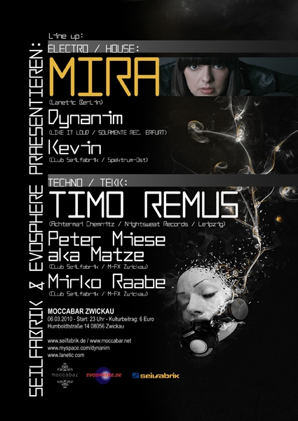 Die graue Winterzeit geht langsam zuneige, also klopft Euch den Schnee aus der Nase, jetzt wird schon im März musikalisches Tauwetter beschworen. Es gibt wieder Diskostoff! Mit dabei ist die wunderbare berliner DJ-Queen Mira mit den besten Electro Tune´s der Stadt. Unterstützung bekommt Sie von Dynamin aus Erfurt, sowie den Residents des Club Seilfabrik. Eine Etage Höher kommen die Freunde des Techno´s wieder ganz auf Ihren Geschmack. Diesmal zu Gast einer der treuen Wegbegleiter des legendären Club Achtermai in Chemnitz ? Timo Remus. Er wird mit klaren soliden Technossound den Schnee vom Dach schmelzen lassen,?Also nicht vergessen im März steht eine weitere Private Obsession Partyreihe in ehrwürdigen Moccabar Zwickau an. Wir freuen uns auf zahlreiches Erscheinen.