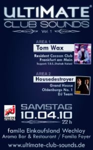 Auf zwei Floors, im Aroma sowie dem opulent designten Haupteingang werden die DJs die Massen bewegen. Als Headliner des ersten Floors steht kein geringerer als TOM WAX an den Reglern. Schon seit Anfang der 90er Jahre als DJ & Producer tätig konnte er mit seinem No. 1 Hit ?It?s our Future? (damals noch unter dem Pseudonym Phuture Wax) Weltruhm erlangen. Er arbeitete schon mit Marusha, Dr. Motte, Mijk van Dijk und anderen namenhaften Künstlern zusammen. Zurzeit legt er regelmäßig in Sven Väths Frankfurter Cocoon Club auf. Seit Januar 2010 ist er nun jeden Donnerstag mit seiner legendären Radioshow ?Phuture Sounds? bei BigCityBeats auf Sendung. Seinen letzten Gig in Oldenburg hatte Tom Wax auf der Maco Abrissparty im August 2008 mit weit mehr als 3000 Besuchern.