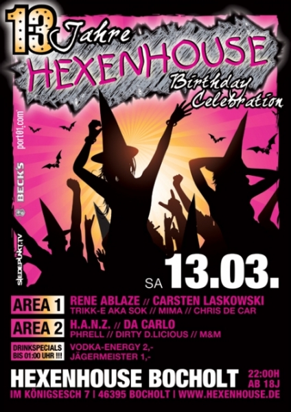 13 Jahre und kein bisschen weise?! Das Hexenhouse feiert seinen 13. Geburtstag! Zu diesem Geburtstag will die Hexenhouse Crew seinen Gästen vor allem eines schenken: Richtig gute Musik! Und so hat das Team einige Wegbegleiter der letzten Jahre eingeladen, die im Laufe der Zeit mit ihrem Sound schon die Partyreihe beglückt haben, und bei dem Gedanken an deren Sets man schon ekstatisch vor Vorfreude mit den Beinen wippt und die einem Freudentränen in die Augen treiben. Natürlich wird es an dem Tag keinesfalls nur Oldschool geben, auch für aktuelle Musik ist mehr als gesorgt! Für beide Floors gibt es jeweils 5 DJs, teilweise aus völlig verschiedenen Epochen des Hexenhouse, und die teilweise von weit her anreisen, um eine völlig neue Mischung der Technokultur zu kreieren. So wird im Mainfloor neben Residents aus der Anfangszeit wie beispielsweise Trikk- E, der für seine legendären Abschlusssets im Empire Plaza in Wesel bekannt war oder auch Rene Ablaze, ebenso die aktuelle Musik gewürdigt, für die kein geringerer als Carsten Laskowski gebucht wurde! Er wird mit ebenso aktuellen wie treibenden Electrosounds die Crowd ausziehen, wie auch die weiteren DJs die für den Mainfloor gebucht sind, so beispielsweise Mima, ein jahrelanger Wegbegleiter, sowie Chris de Car, einer der aktuellen Residents, der ebenfalls für seine abwechslungsreichen Sets bekannt ist. Wie man sieht, für jeden Geschmack das passende dabei!