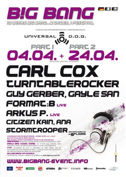 Die ?Big Bang?-Eventreihe gehört seit Ihrem Start im April 2000 - damals noch im legendären Centennials Club / Gebäude A22 in Lahr zu Hause - zu den beliebtesten und erfolgreichsten elektronischen Musikevents im gesamten Dreiländereck (Süddeutschland - Frankreich - Schweiz). ?Big Bang? steht für erstklassige internationale Künstler der verschiedensten elektronischen Musikrichtungen - die weltbesten Acts wie u.a. Sven Väth, Laurent Garnier, Jeff Mills, Dave Clarke, Magda, Rush, Chris Liebing, Marco Carola, Monika Kruse, Ben Sims, Slam, Kevin Saunderson, Tocadisco, Umek, Lexy & K-Paul, Tom Novy, Karotte, Gayle San und viele, viele weitere mehr haben bereits auf BIG BANG-Events gespielt! Seit 2008 ist Big Bang mit Veranstaltungen in Frankreich (Region Straßburg) und Schweiz (Basel) zudem international! Im April 2010 wird BIG BANG zehn Jahre alt - wenn das kein Anlass für eine ausgelassene Sausse ist! Um das Ganze gebührend zu feiern werden die Veranstalter der BIG BANG im April gleich zwei Mal zum Tanz einladen - 10 Jahre BIG BANG, 2 Dates (Ostersonntag 4.4. + Sa. 24.4.), 1 Festival! Das Beste daran: mit dem günstigen Kombiticket einmal bezahlen und zwei mal Feiern! Die Preise des Kombitickets sind so gehalten, dass die Gäste des 4.4. quasi den Eintritt am 24.4. dann ?geschenkt? oder als Zugabe obendrein bekommen! Das Line-Up zum 10jährigen ist immens: allen voran freuen wir uns über die Zusage von Carl Cox - der Engländer gehört seit den ersten Stunden des Techno weltweit zur Elite der DJs und findet neben Kollegen wie Sven Väth, Jeff Mills und Dave Clarke Platz in den Geschichtsbüchern der elektronischen Musik. Als in den 1970ern ein kleiner Junge namens Carl mit seinen Eltern von Barbados ins englische Manchester zog, konnte noch keiner ahnen, dass er einmal einer der wichtigsten Techno-DJs aller Zeiten sein würde. Er ist derjenige, der erstmals professionell und gekonnt wie kein Anderer mit drei statt den üblichen zwei Plattenspielern gleichzeitig auflegte und seinen Ruf als ?Three-Decks-Wizard? festigte. Derjenige, der mit "I want you" schon 1991 einen Hit landete, der sogar in den britischen Charts einstieg. Und er war derjenige, der mit seiner Mix-CD "F.A.C.T." das Format des vom DJ gemischten Silberlings erstmals populär machte. Kurzum: ist der ?King of Clubs?, die Verkörperung von pumpendem Techno, was er im Sommer jeden Dienstag mit seiner Residency "Carl Cox and Friends" im Space auf Ibiza aufs Neue beweist. Aber auch die weiteren ?Gratulanten? und Hauptacts wie die Turntablerocker, Guy Gerber, Gayle San, Format:B live, Arkus P., Citizen Kain, Stormtrooper, Ana, The Deathmaker und viele, viele weitere Djs mehr werden euch an den beiden Terminen mit Sicherheit verzücken und schweißtreibende Stunden auf den jeweils fünf Dancefloors im Universal D.O.G. (Lahr) bescheren! Im Vorverkauf sind ausschließlich Tickets für beide Termine (Kombiticket 4.4. + 24.4.) erhältlich, das VVK-Ticket gilt daher für beide Termine! Für die einzelnen Abende gibt es ausschließlich Tickets an der Abendkasse! Early Bird Ticket Kombi: nur 19 EUR (zzgl. Versand, keine VVK-Geb.!), limitiert auf 250 Tickets, erhältlich nur über den Nitebeat Eventshop unter www.nitebeat.de/shop - wenn weg dann weg! VVK Kombi (4.4. + 24.4.) regulär ab Anfang März: 26 Euro (+ VVK-Geb.) an allen Stellen wie z.B. www.reservix.de, shop.nitebeat.de, FNAC + Carrefour (www.fnac.com) und an den üblichen bekannten Stellen! 50 limitierte VIP-Ticket (Kombi, 4.4. + 24.4.) mit VIP-Bar, Bühnenzugang usw.: 79 Euro + Versand, nur erhältlich auf www.nitebeat.de/shop Abendkasse: 25 Euro Solo-Ticket, d.h. je Abend; bzw. 35 Euro Kombiticket (4.4. + 24.4.) an der Abendkasse am 4.4. More infos: www.bigbang-event.info