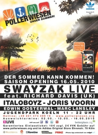 Der Kölsche Sommer beginnt immer etwas früher... mit dem PollerWiesen-Opening am 01. Mai. Auch 2010, zu Beginn der neuen Dekade, soll mit dieser Tradition nicht gebrochen werden. Ein gewohnt exzellentes LineUp erwartet die Besucher ? mit lebenden Legenden, internationalen Stars und lokalen Helden, zu einem perfekt abgestimmten Gesamtpaket verschnürt und den Jugendpark am Rhein einmal mehr zur besten Open-Air-Location in Innenstadtnähe erklärend.