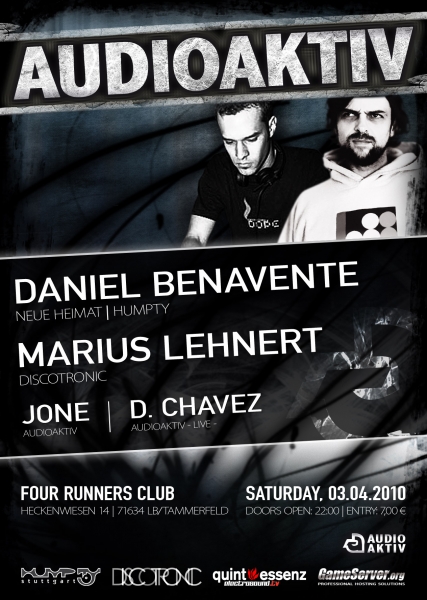 Axel Masanek und Daniel Schirpf, bekannt aus dem guten alten Studio 2, haben mit AUDIOAKTIV eine neue Veranstaltungsreihe ins Leben gerufen. Unsere Gäste erwartet ein ganz besonderes Flair mit absolut kompromisslosen elektronischen Klängen im 4/4 Takt. Für unsere Eröffnung haben wir uns ganz bewusst den neu renovierten und gestalteten Four Runners Club ausgesucht, weitere Events in Stuttgart und Umgebung sind bereits geplant. Zum Einstand haben wir zwei Stuttgarter Acts am Start, welche sicherlich einen spektakulären Einstand feiern werden. Daniel Benavente, ein Stuttgarter Techno-Urgestein, wer erinnert sich nicht an die legendären Nächte im Prag? Der gebürtige Spanier betreibt seit nunmehr 11 Jahren den Plattenladen Humpty, und wird nicht nur eine Menge frischen Sound mitbringen: Im Gepäck ist Marius Lehnert, ebenfalls ein Mann der Humpty-Crew, welcher sich in den letzten Jahren mit DISCOTRONIC im Stuttgarter Rocker 33 zu einer festen Grösse etabliert hat. Abgerundet wird das Ganze durch die AUDIOAKTIV-Residents Jone und Chavez, letzterer wird an diesem Abend live performen, ebenfalls zwei absolute Garanten für minimalen Sound der Extraklasse und eine unvergessliche Nacht.