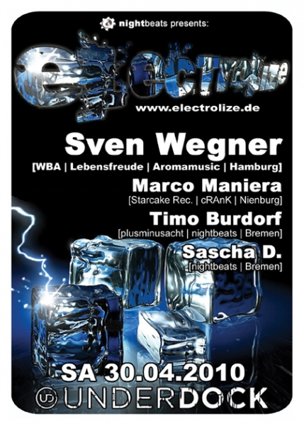 Nach der erfolgreichen Electrolize Opening Party mit Anna Reusch geht es nun in die 2te Runde! Am Freitag, den 30.04.2010 tanzen wir mit Euch im Underdock Club in den Mai hinein und präsentieren euch diesmal Sven Wegner.