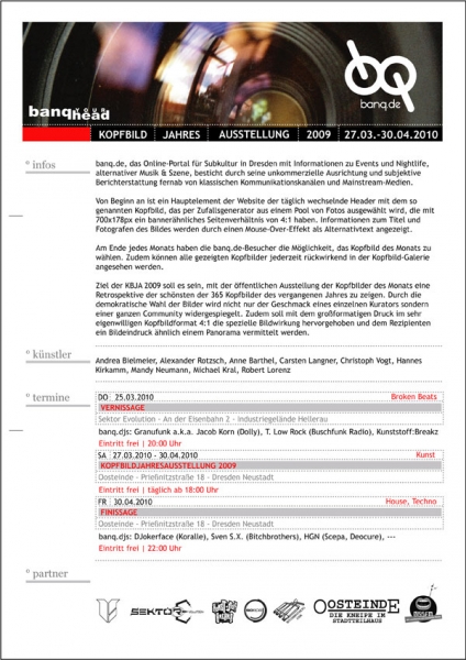 Erstmals haben wir beschlossen, unsere Kopfbildfotografen mehr zu würdigen. Deshalb werden wir am 25. März die besten Kopfbilder des Jahres 2009 im Rahmen einer Ausstellung zeigen. Dabei laden wir zur Vernissage ab 20 Uhr in die Halle des Sektor Evolution im Industriegelände ein. Musikalische Ohrenfreuden werden dort von Granufunk aka Jacob Korn, Kunststoff:Breakz und T.Low Rock geboten.