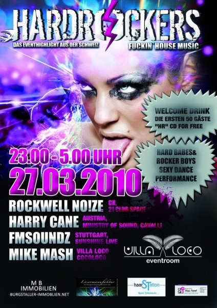 Samstag, 27.03.2010 / 23 Uhr Hard Rockers @ Villa Loco (Schorndorf) 4 Dj´s/Specials Musikalische Eskalation direkt aus der Schweiz! Die Hard Rockers Crew wird am 27.03.2010 zum ersten Mal in der Villa Loco mit ihren House & Elektro Beats die Tanzfläche zum Beben bringen! Die beiden Brüder und Initiatoren des Hard Rockers ? Events, ROCKWELL NO!ZE (Switzerland, 21 Club, Baya Lounge, Fame), die durch zahlreiche Gigs in der Schweiz wie auch in Frankreich für Aufsehen gesorgt haben, begrüßen den österreichischen Star DJ HARRYCANE der mit seinen beliebten Sets die Clubs weltweit beglückt! Begleitet werden sie von FMSOUNDZ (Sunshine Live) und Villa Loco & COCOLOCO Macher MIKE MASH, den Hard Babes &Rocker Boys (Dance Animation), die Dich mit ihrer Dirty Show so richtig in Fahrt bringen werden! Als Specials gibt es die Hard Rockers Deko, eine Lasershow, 150 Welcome-Drinks, eine Champagner Verlosung, und für die ersten 50 Gäste die neue "Hard Rockers" Cd for free! We´ll ROCK this Night?! FMSOUNDZ 23:00 - 0:00 Uhr Rockwell No!ze 0:00 - 2:00 Uhr DJ HARRYCANE 2:00 - 4:00 Uhr Mike Mash 4:00 - 5:00 Uhr